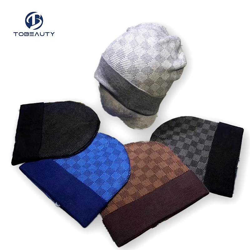 New Arrival Designer Winter Cap Soft Warm Acrylic Knitted Beanie Hat Single Cuff Letter Printed Checkered Checkerboard Pattern