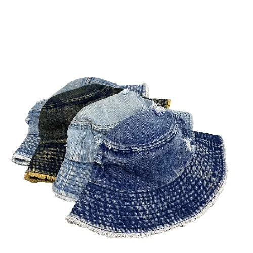 Distressed Vintage Wide Brim Jean Denim Fisherman Bucket Hats Frayed Ripped Vintage Fisherman Cap
