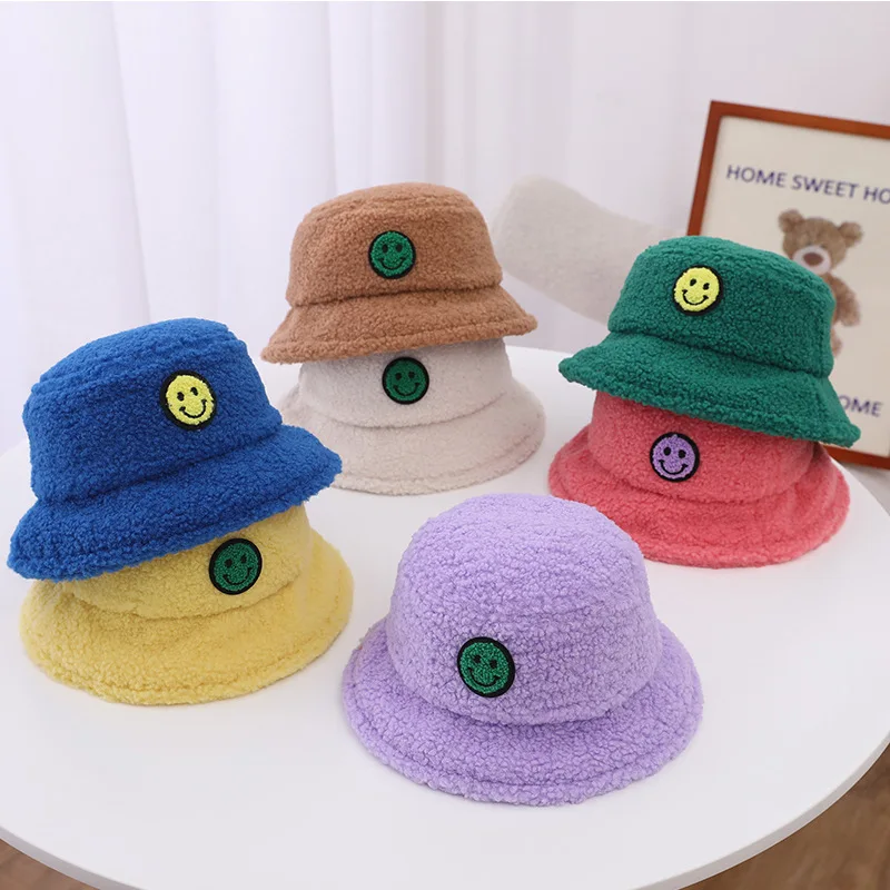 New Designer Vintage Fashion Custom Furry Fluffy Faux Hat Smile Face Teddy Bucket Hat for Kids Toddler