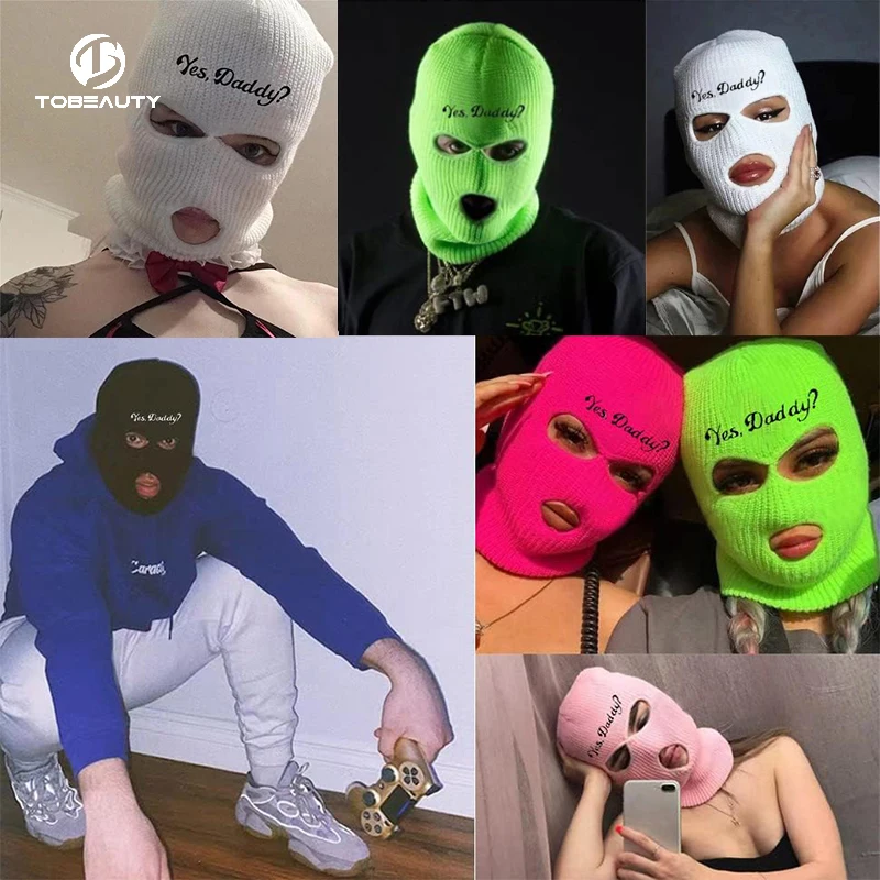 Custom Embroidery Logo Outdoor beanie;White Black 3 Holes Neon Balaclava Men ;Knitted Ski Mask