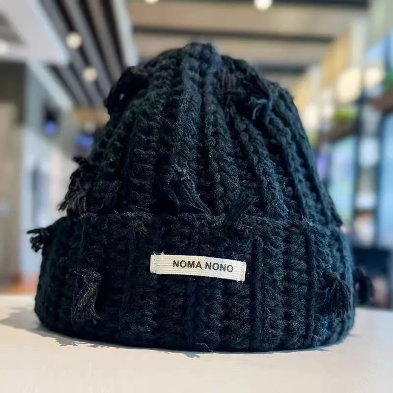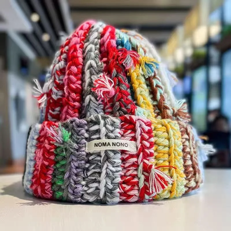 Winter Retro Rainbow Crochet Handmade Distressed Knitted Beanie Hats multicolor beanie stripe split knitted beanie